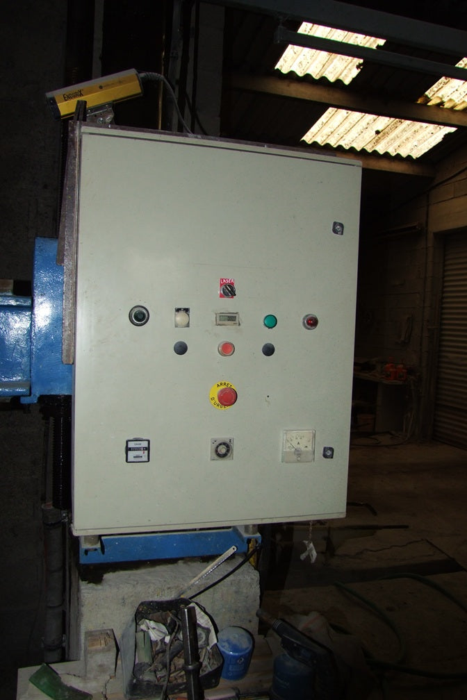 Débiteuse fixe à colonnes d'occasion de marque CEBE prévue pour disque diamètre 725 mm. Mouvement de coupe automatique cycle granit par passes successives. Armoire électrique neuve très récente. Table tournante et roulante manuelle. Bon état général, encore en fonctionnement. PRIX HT démontage et chargement en sus.